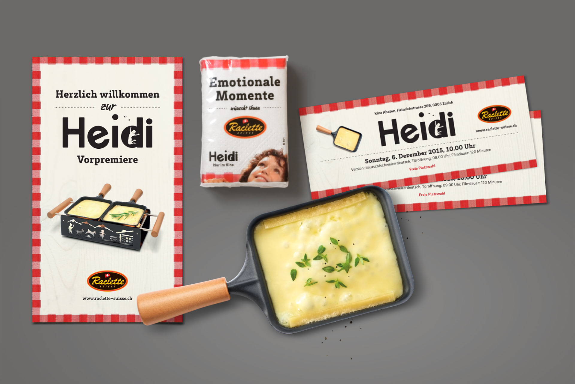 An der Vorpremiere des Weltklassikers in Bern und Zürich kamen sowohl Filmfans wie Raclette-Liebhaber auf ihre Kosten. Nebst den Kommunikationsmittel realisierte Reflektor die Kinodias, Tickets, Taschentücher und Staff-Shirts für den Event. Ausserdem wurde ein exklusives «HEIDI»-Racletteöfeli lanciert.